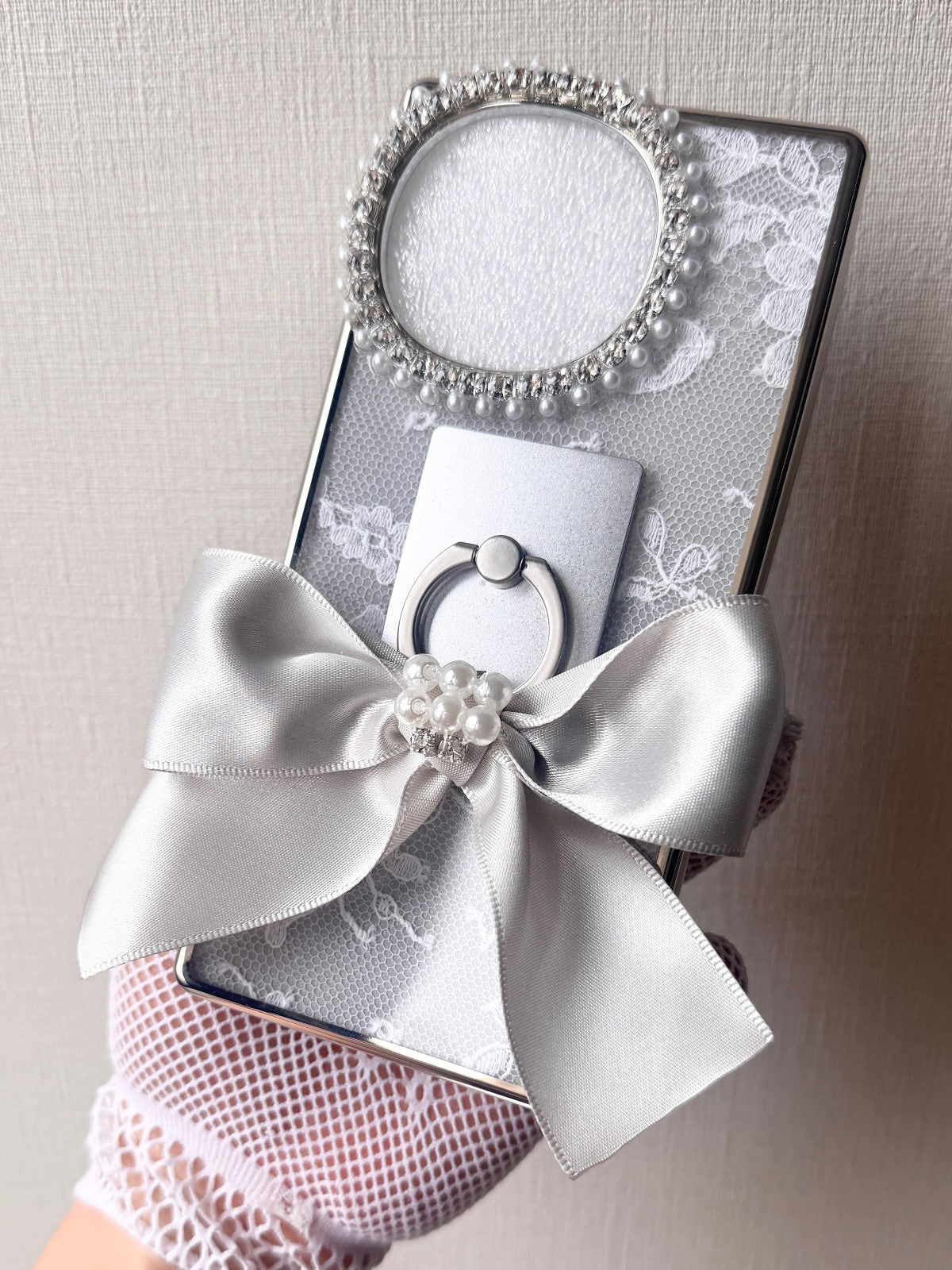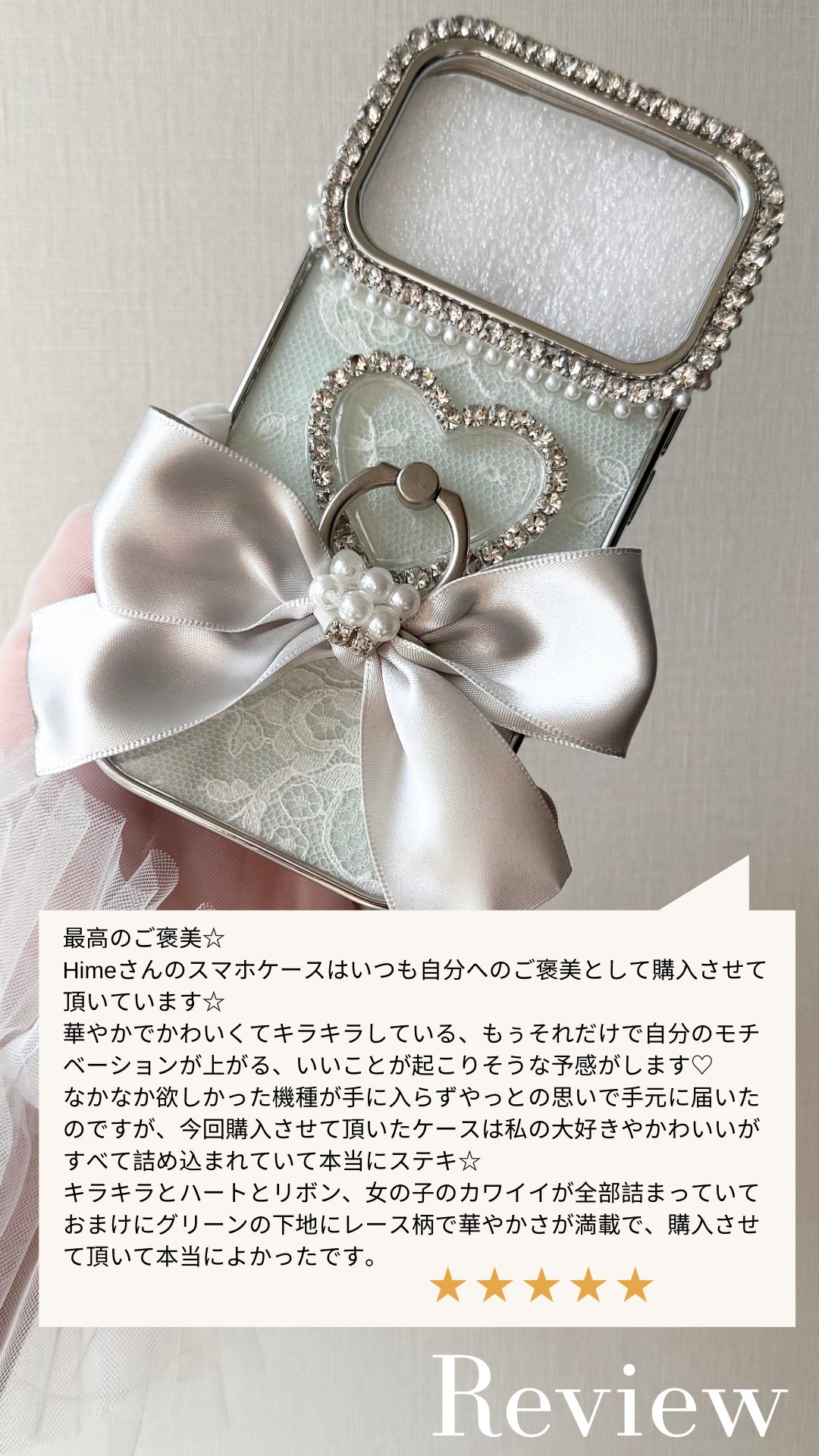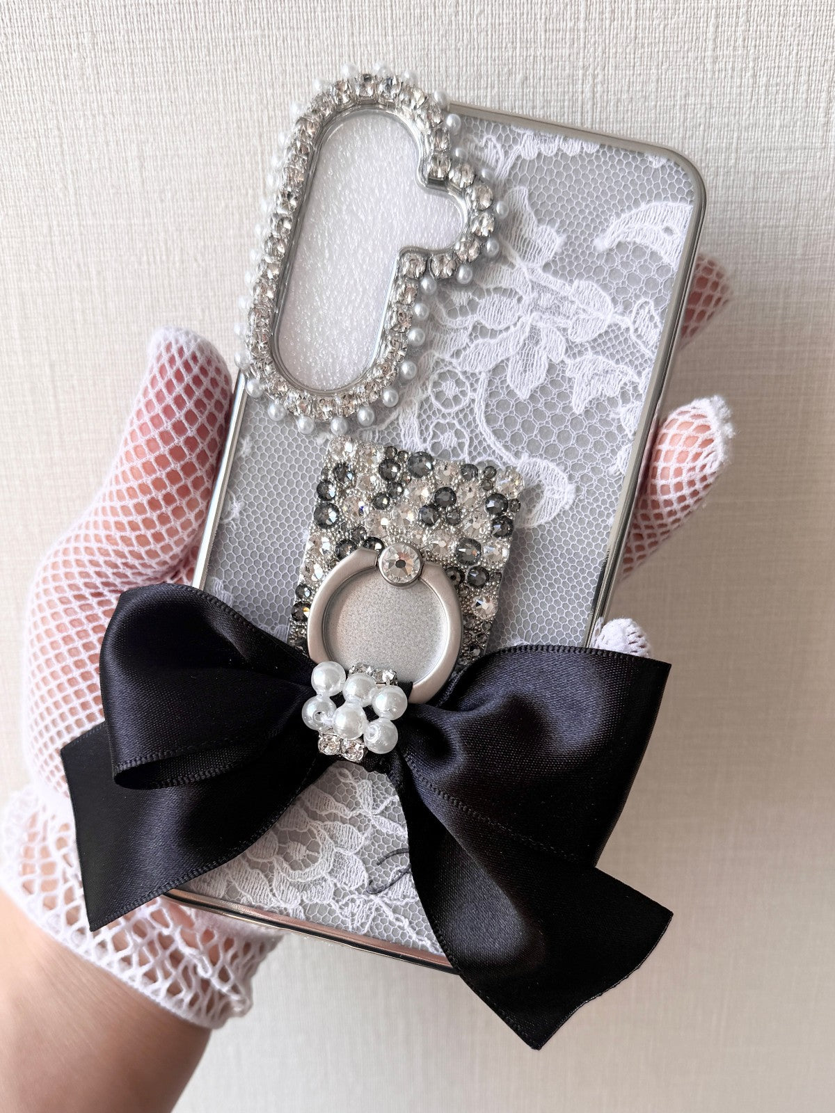 今回は、スマホリングにスワロフスキーを、リボンにイニシャルをそれぞれオプションでつけてもらいました。大変可愛らしいお品で、大満足です。リボンやレース下の色味を変えたりオプションを追加することで、その人の個性を出すことができる素敵なケースです。大切に使用します。