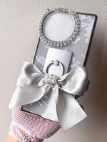 Himeさんのケースは3つ目です。まずはティファニーカラーのケース、そして今回と同じレースですが手帳型が2つ目。レース、ビジュー、パールにリボンと大好きなものを詰め込んだケースで、持っていて幸せな気分になります。リボンにイニシャルも付けていただきました。リボンの色もレースと同じグレーにするか水色にするか迷ったのですが、綺麗な薄い水色で今からの季節にぴったりでした!