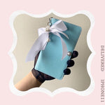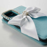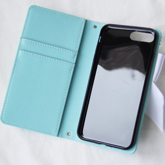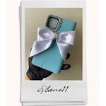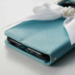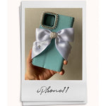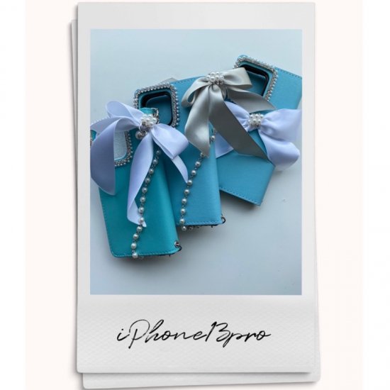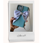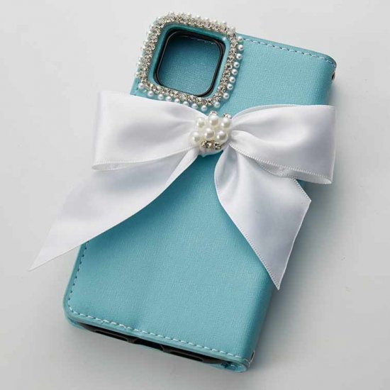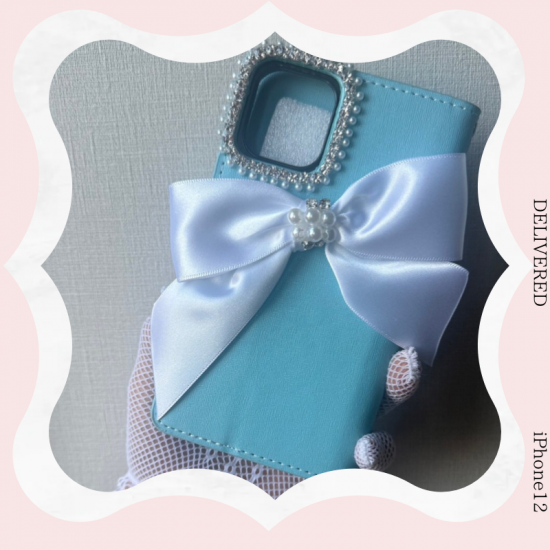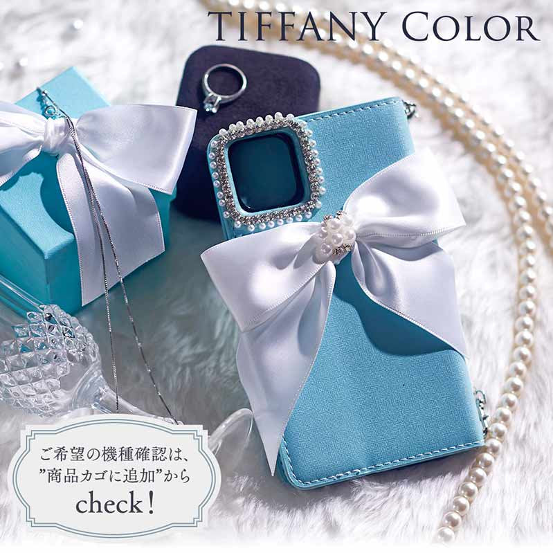 このケースはティファニーブルーのカラーとパールリボンが相まって、特別な日の装いやおしゃれなデートにぴったりです。
