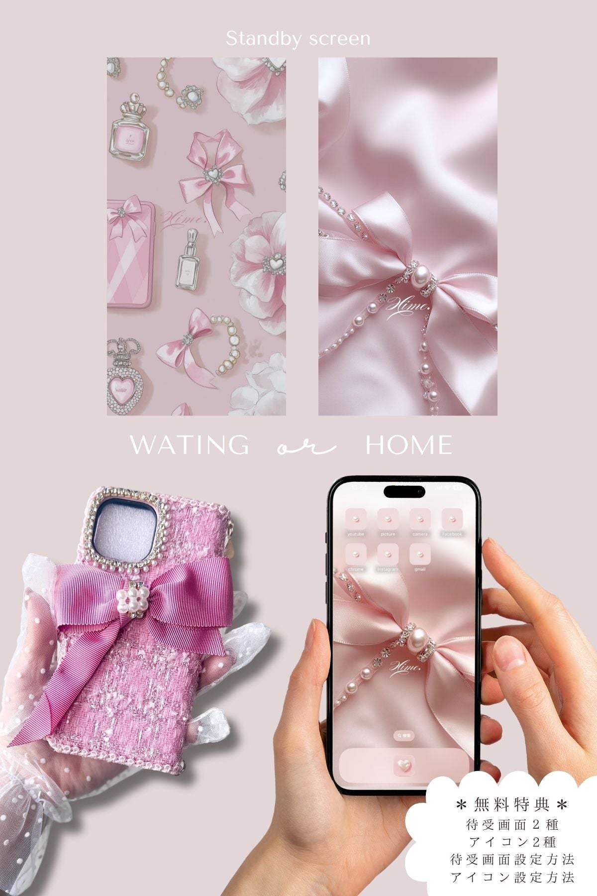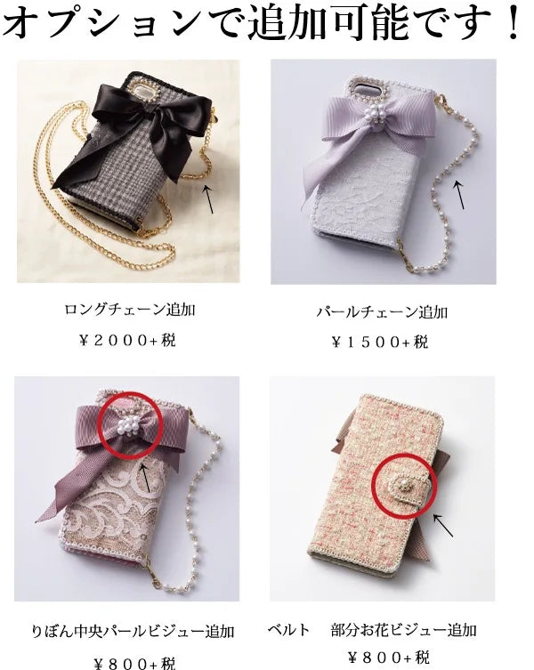 手帳型iPhoneケース・グログランリボンラインストーン・樹脂パール・樹脂