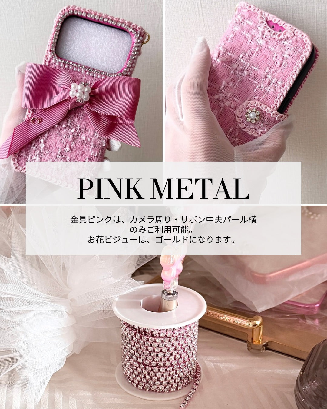 ピンクを選択の場合、カメラ周りデコのみピンク可能。オプションでお花ビジュー・両サイド穴開け等は全てゴールドで対応になります。オプションリボン中央パール横ストーンのみピンク金具可能