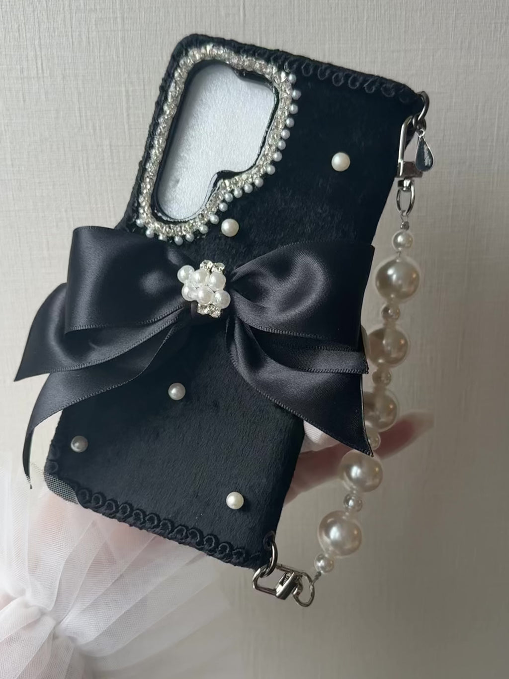 Luxury iPhone Case with Velvet Ribbon – Handmade Designer Case with Pearl Chain & Rhinestone