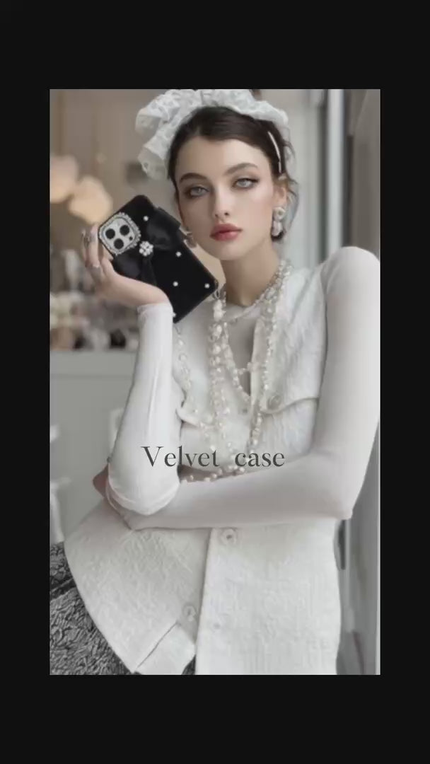 This luxury iPhone case is handmade with a soft velvet ribbon and elegant pearl chain.