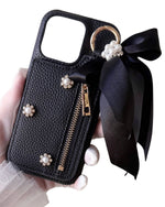 Hime. Elegant French Girly Black Ribbon iPhone Case with Card and Coin Pockets (Compatible with All Models)