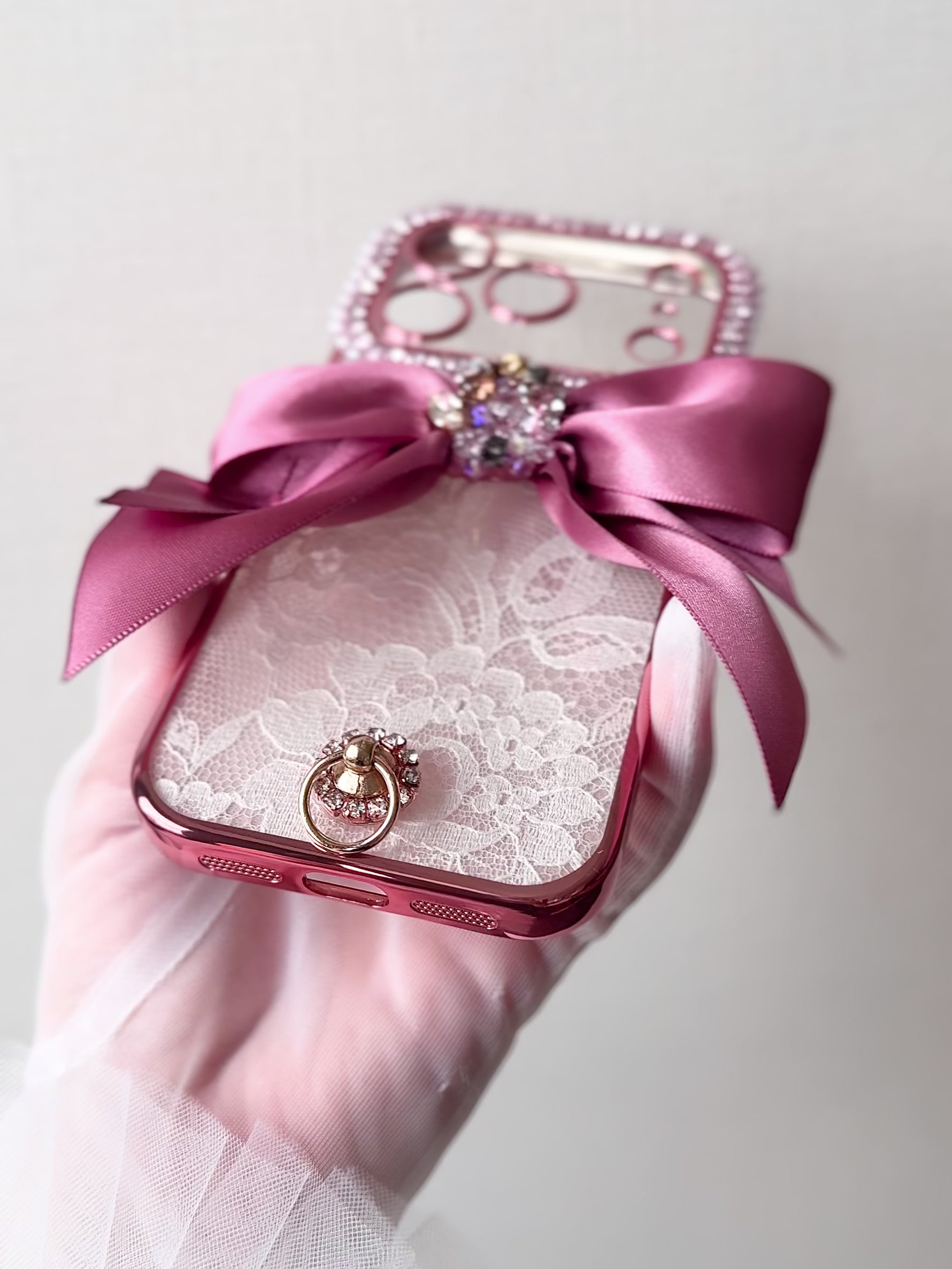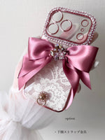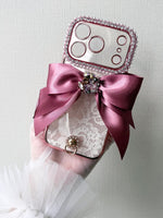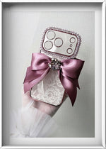 This handcrafted wallet-style iPhone case features exquisite French lace accented with an elegant flip ribbon, creating a soft yet sophisticated girly look.