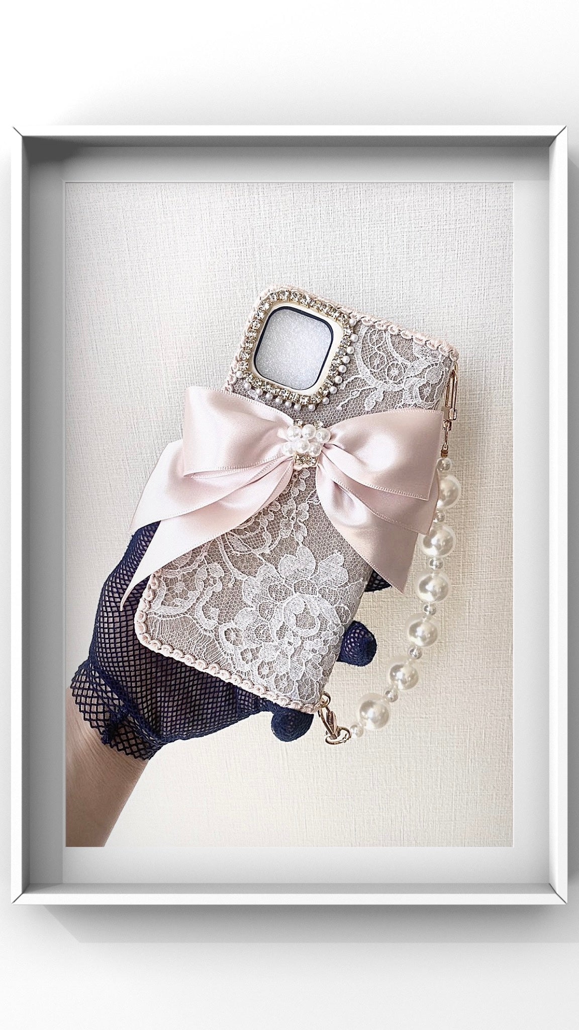 Hime. French Girly Lace Ribbon Wallet-Style iPhone Case with Pearl Chain (Compatible with All Models)