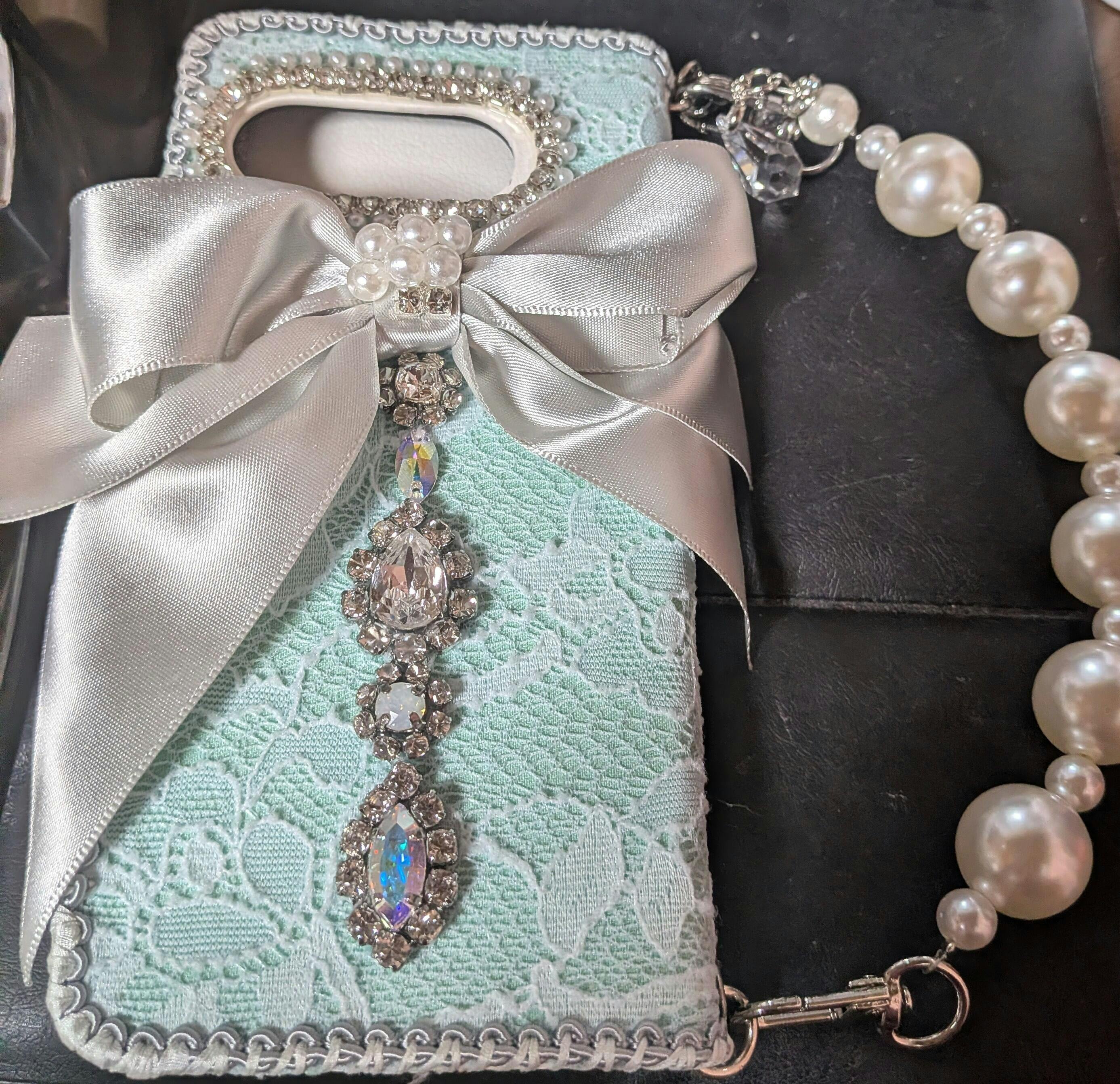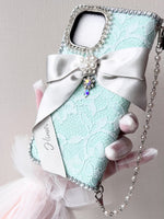 Luxury French Lace iPhone Case with Ribbon – Handmade Designer Case with Pearl Chain