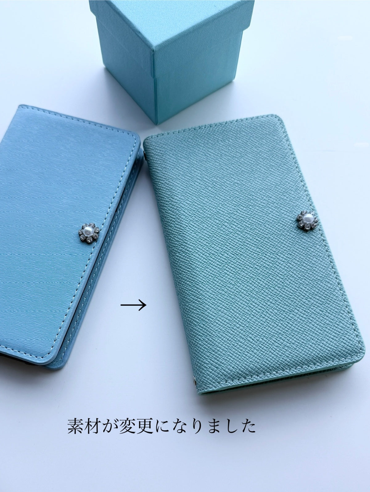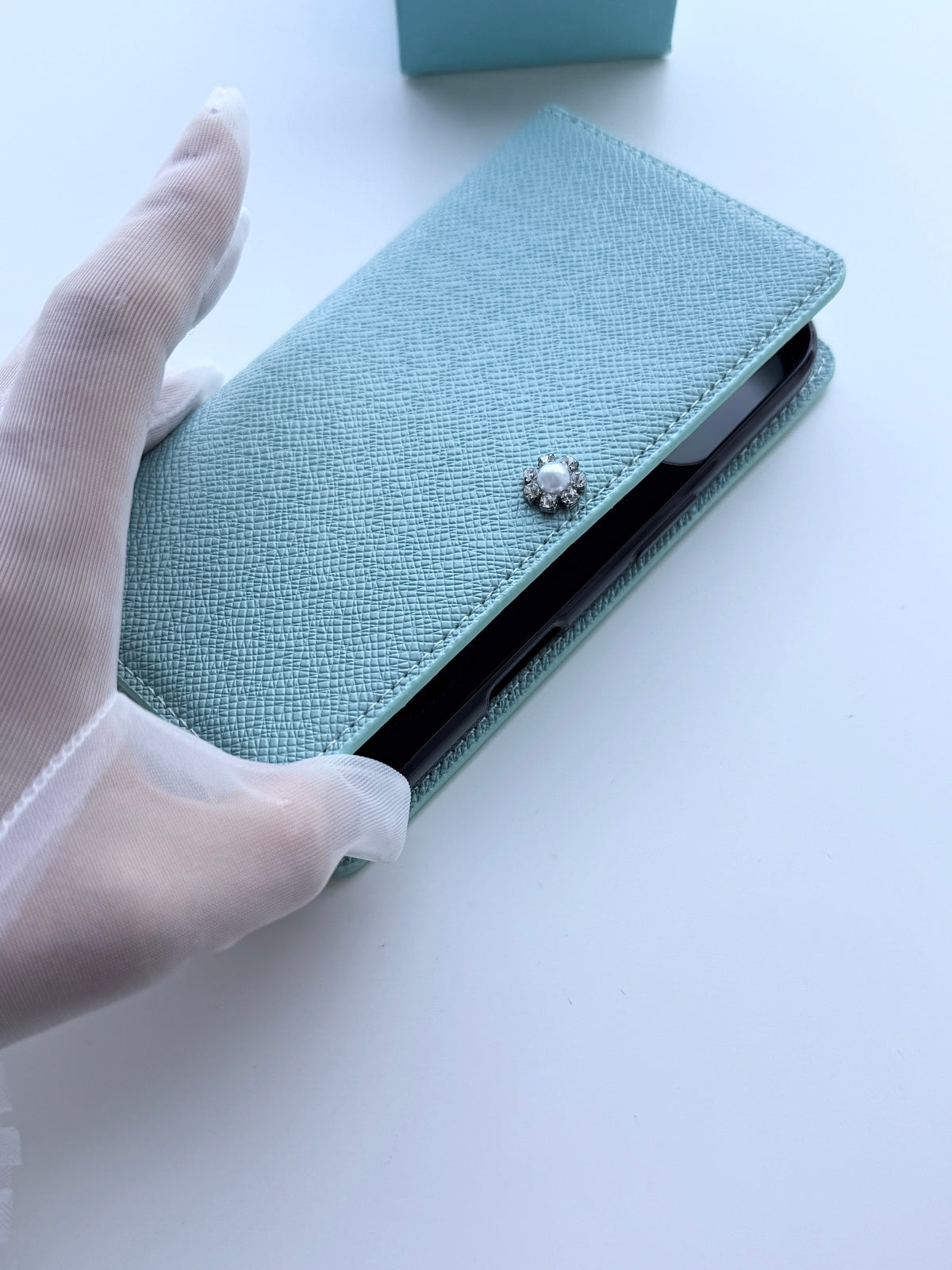 ✦ 上品なティファニーカラーに艶パールを添えた、大人女性のためのスマホケース