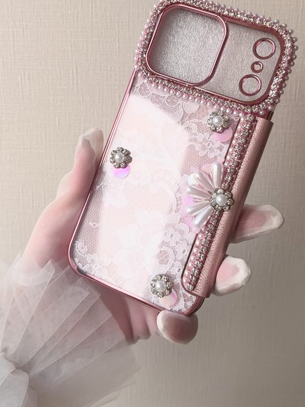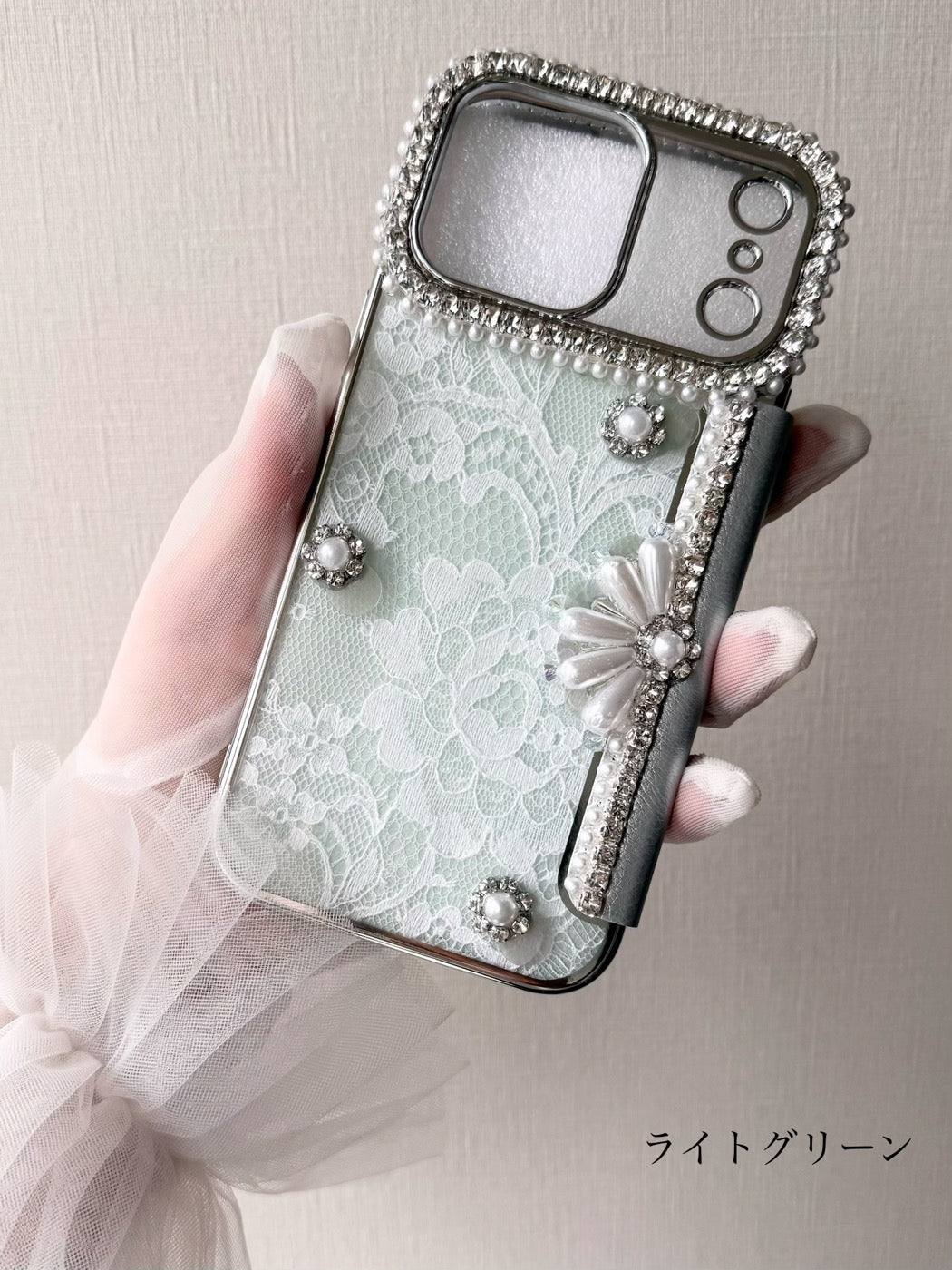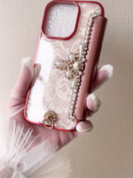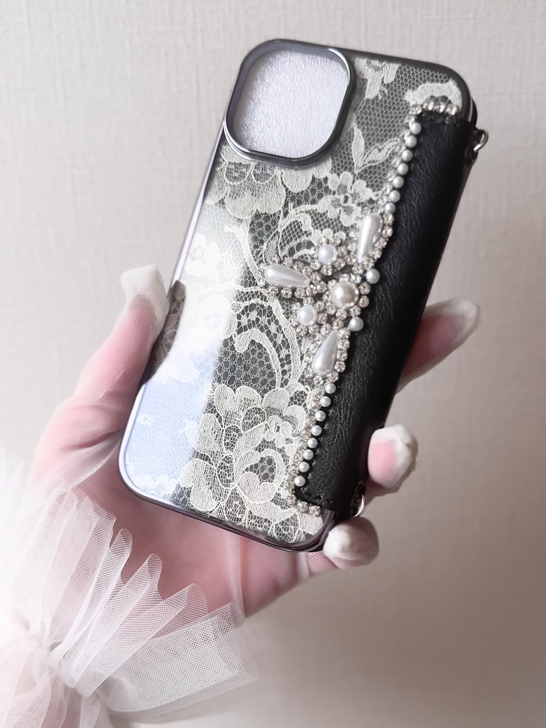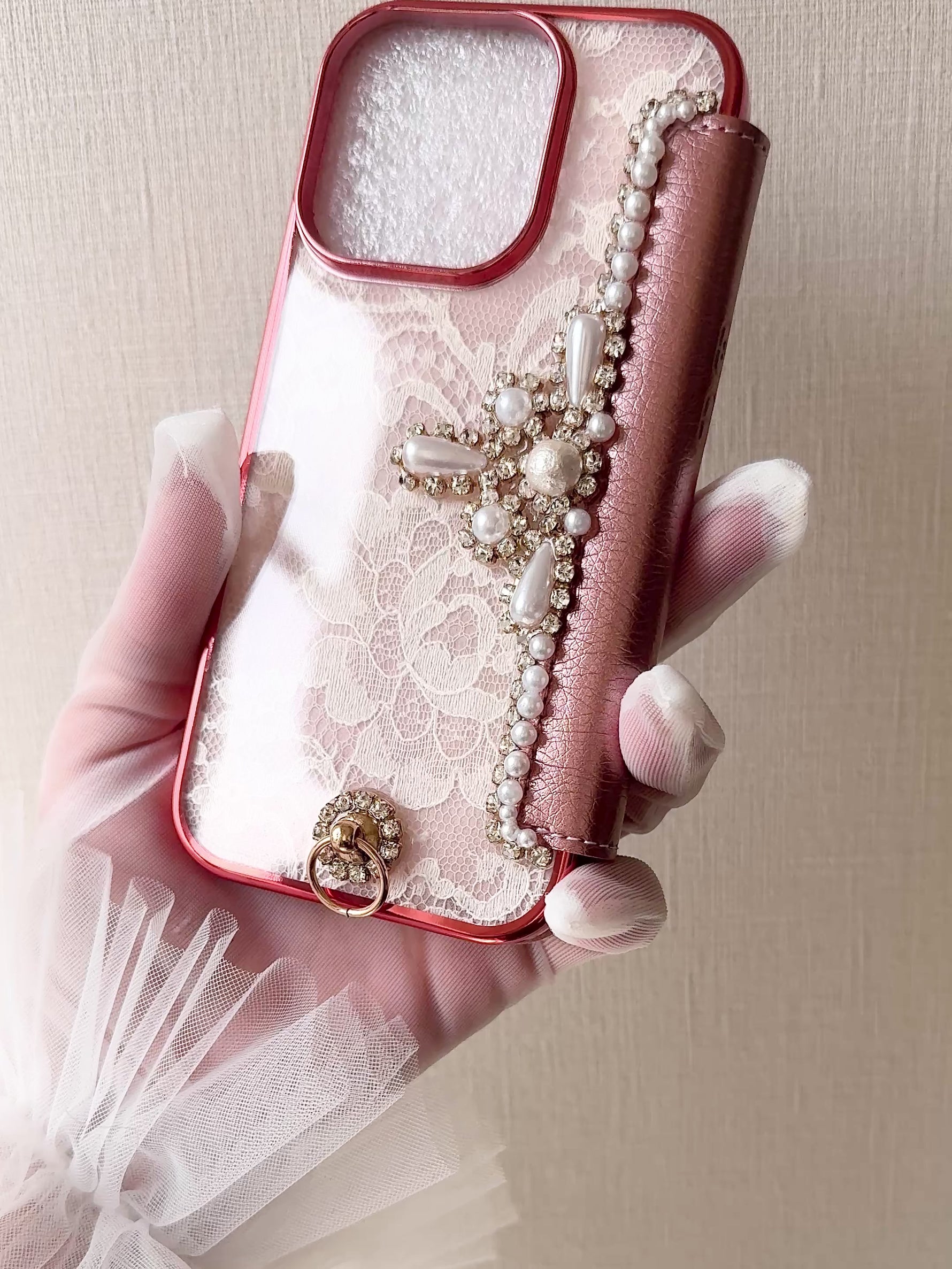 Hime. フランス製高級リバーレースハンドメイドフリップタイプオーダー iPhoneケース|大人可愛い×パール装飾(全機種対応)