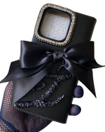 Hime. エレガントフレンチガーリー イニシャルデコリボン 手帳型iPhoneケース|ブラックレザー×ビジュー装飾(全機種対応)