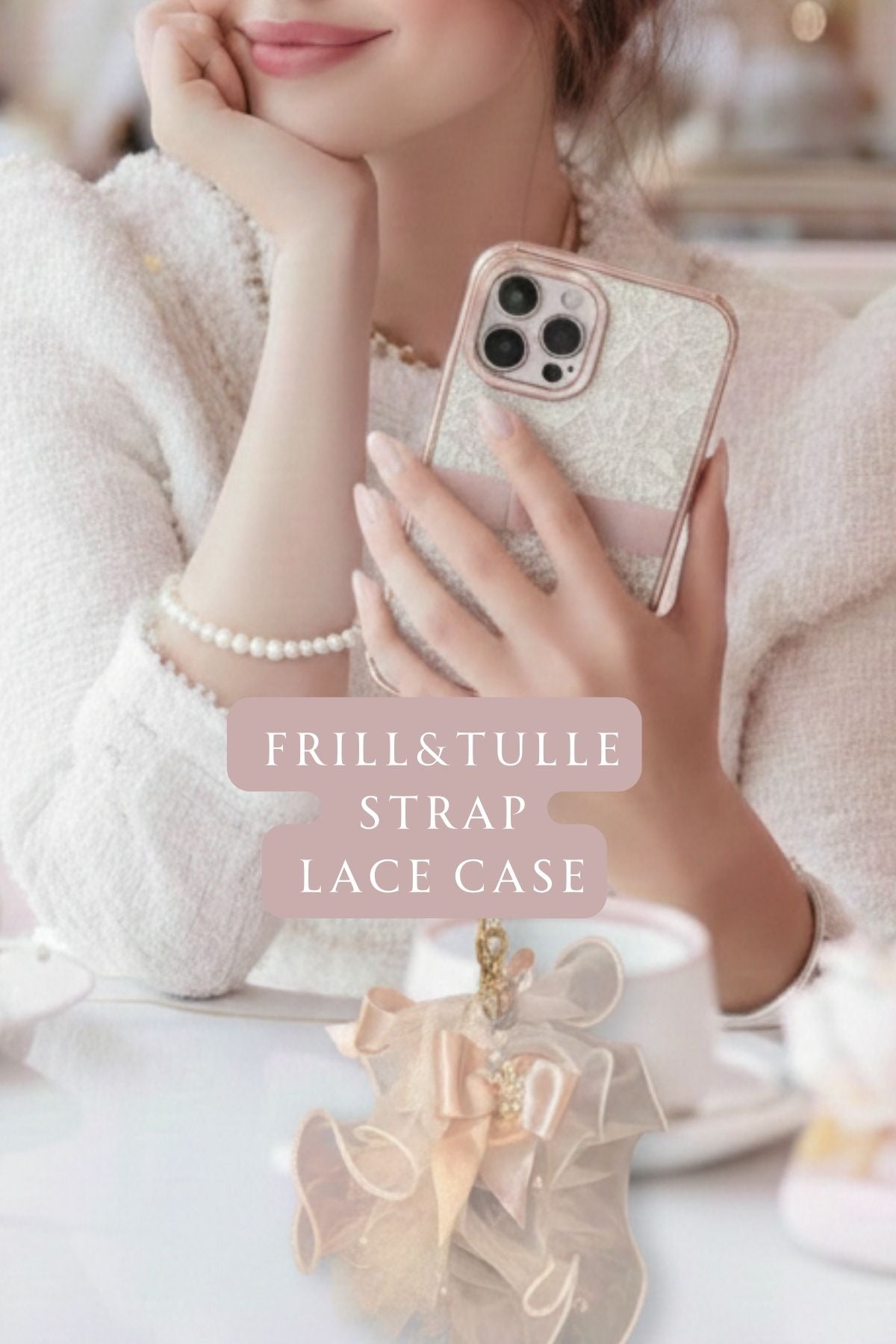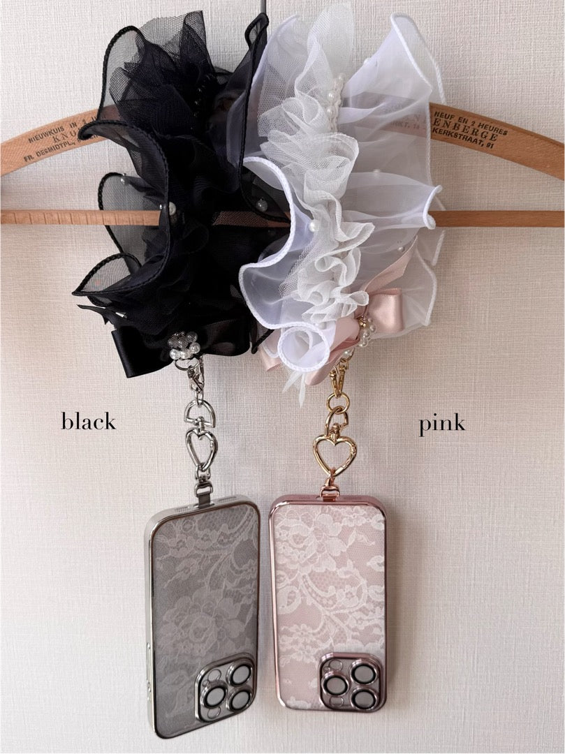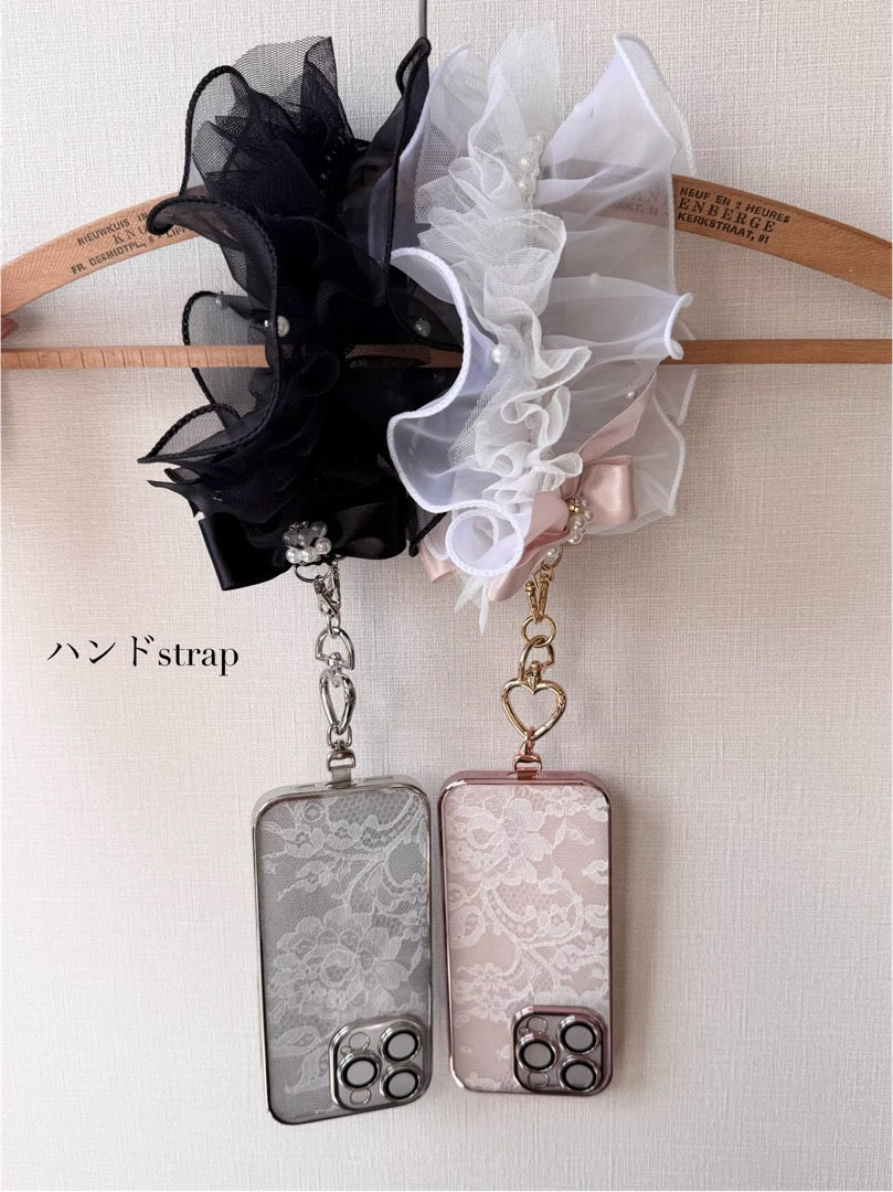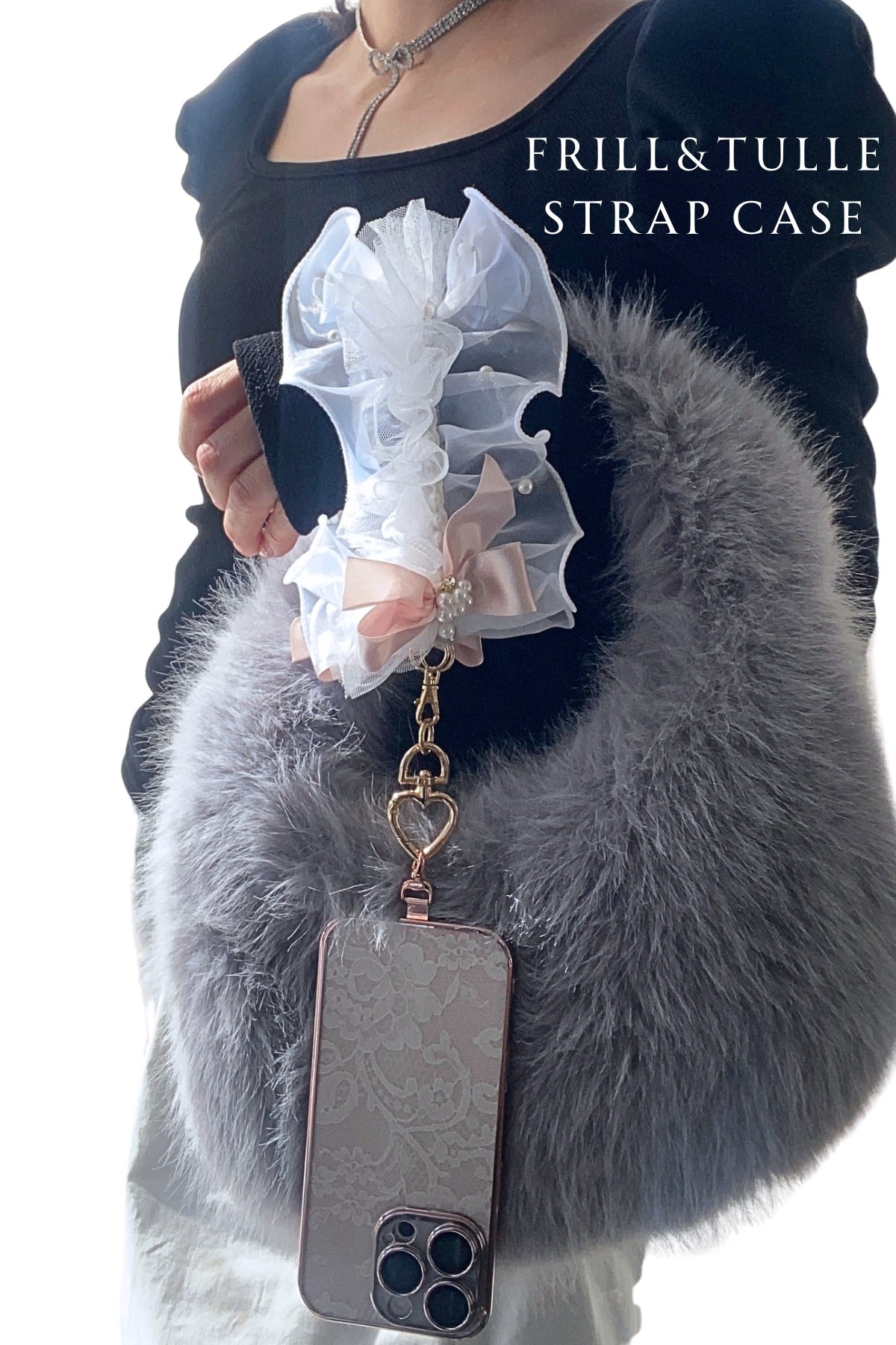 フリル&チュールのハンドストラップ付きスマホケースです。