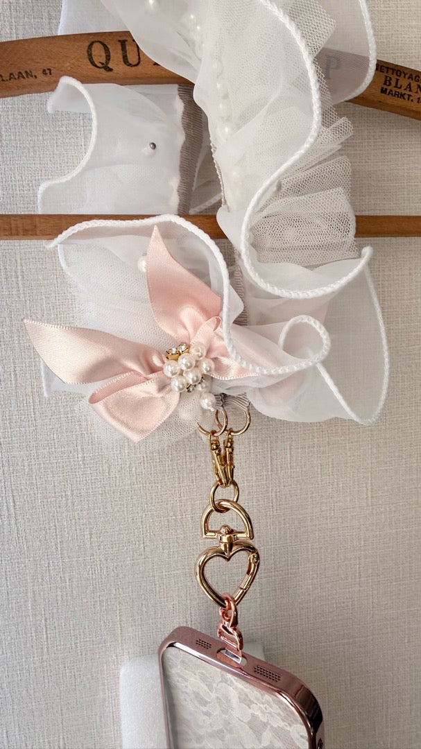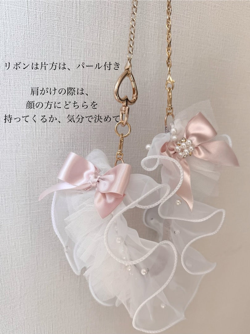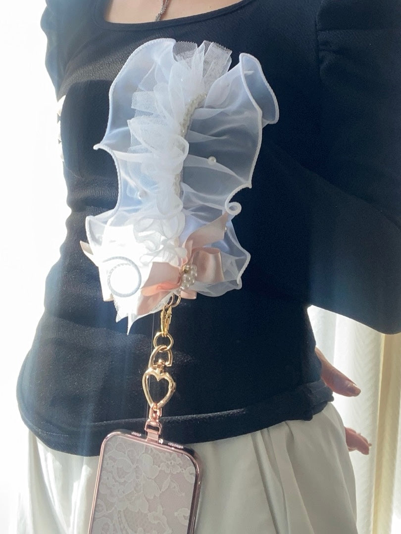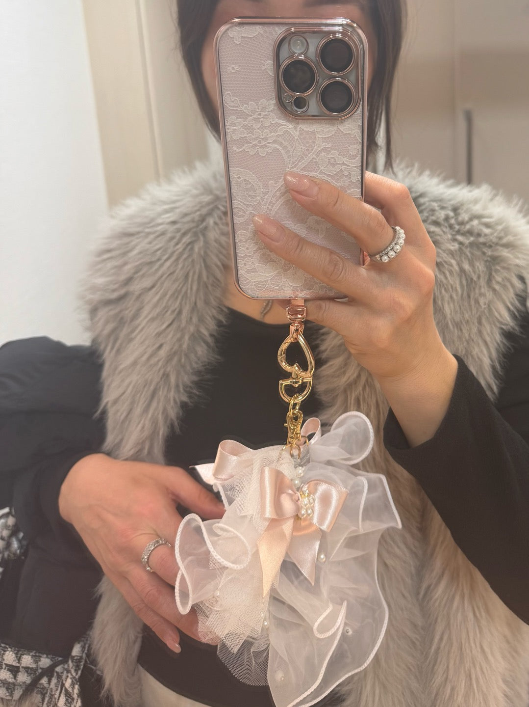 フリル&チュールのハンドストラップ付きスマホケースです。