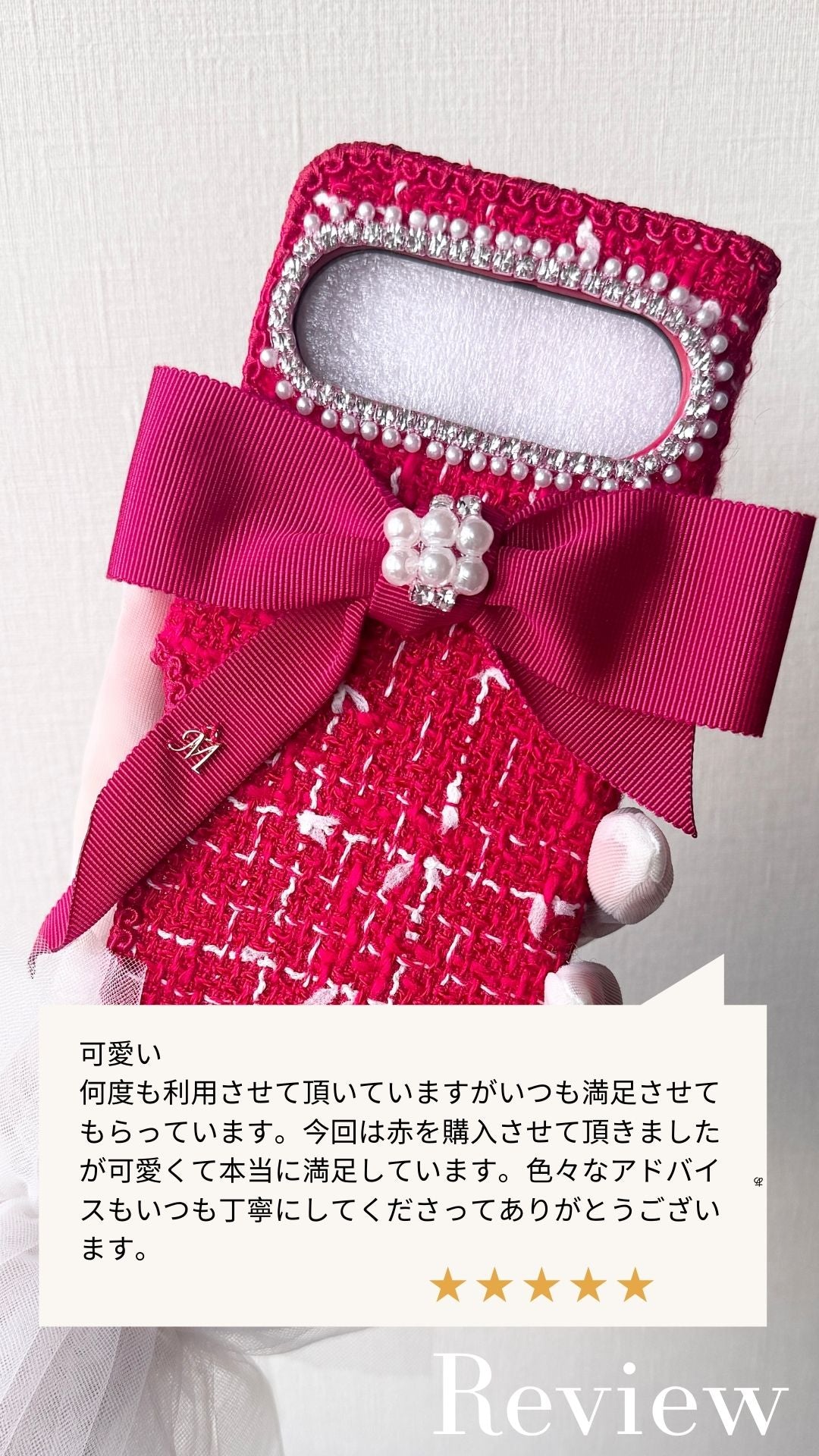 ピンクを選択の場合、カメラ周りデコのみピンク可能。オプションでお花ビジュー・両サイド穴開け等は全てゴールドで対応になります。オプションリボン中央パール横ストーンのみピンク金具可能